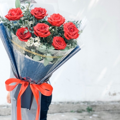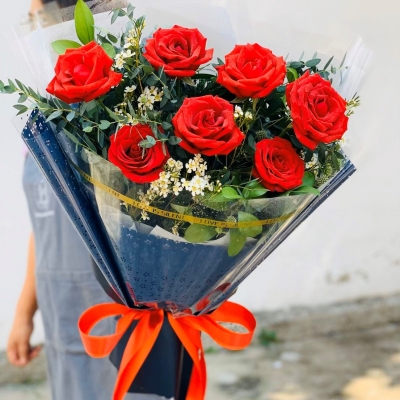 Prepare for festivals of happiness with precious bouquet. A fresh mixed arrangement showcasing 7 red roses. Start a good day with delightful and glamorous flowers.