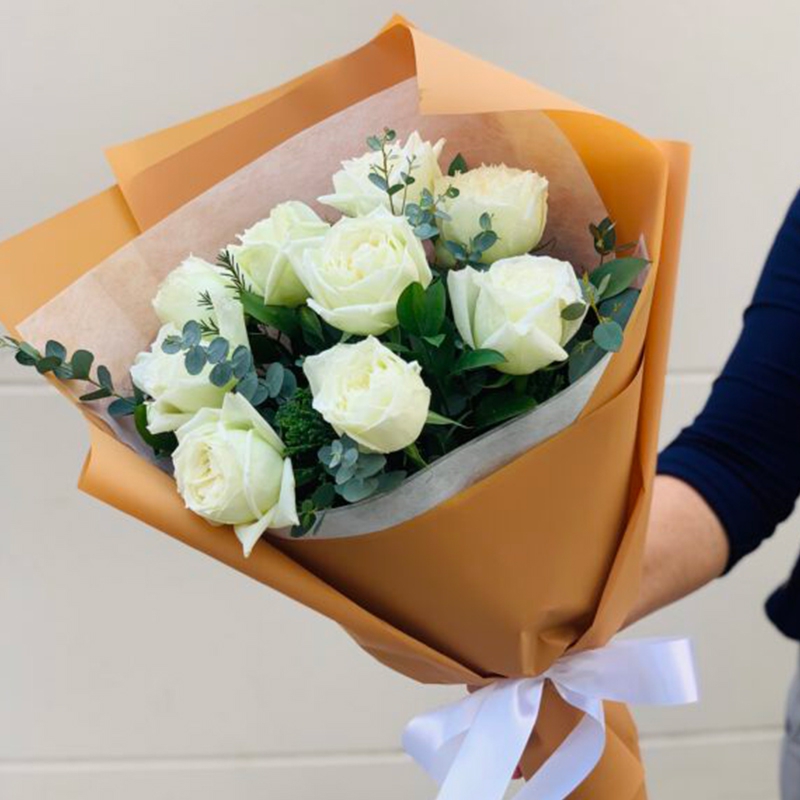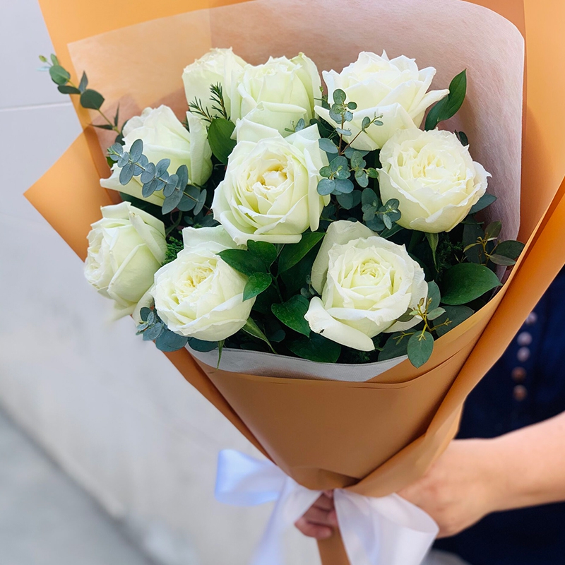 Prepare for festivals of happiness with precious bouquet. A fresh 10 white roses are arranged in hand tie style. Start a good day with delightful and glamorous flowers.