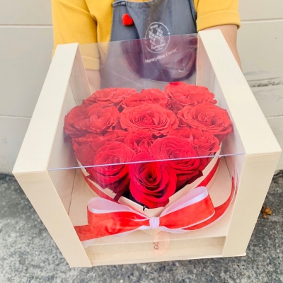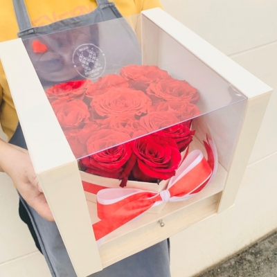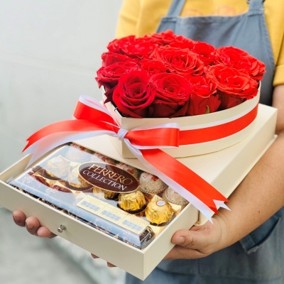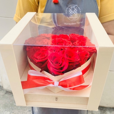 The elegance of Charming 9 red roses Flower in the premium box is perfect as a gift for someone very special. The special of this luxury box is having drawer to insert the big pack of Ferrero Rocher chocolate. Love it!!