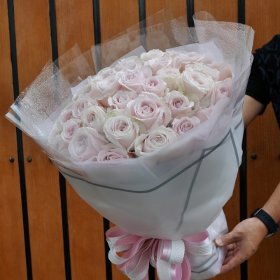 Prepare for festivals of happiness with precious bouquet. A fresh 40 pink roses are arranged in hand tie style. Start a good day with delightful and glamorous flowers.